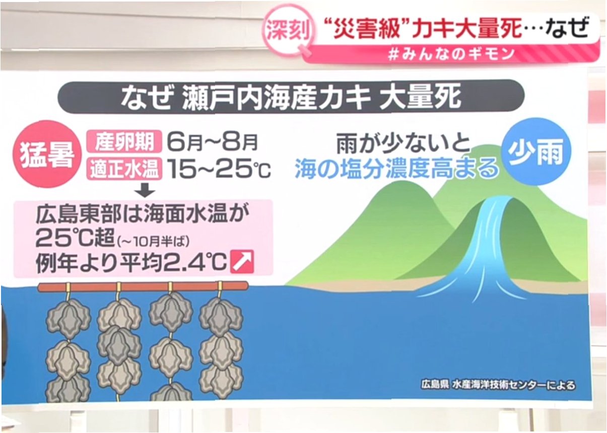 스즈키 노리카즈 농림수산상은 지난 19일 현지를 시찰한 뒤 “수십 년 동안 이런 심각한 상황은 처음이라는 업자들의 목소리를 들었다”며 “중앙 정부와 지방 정부가 긴밀히 협력해 전체적으로 경영을 지탱할 수 있게 하겠다”고 밝혔습니다. 전문가들은 이러한 상황의 원인으로 기후변화에 따른 해수 온도 상승을 지목했습니다. 히로시마 해수 온도는 예년보다 약 2도 높은 것으로 알려졌습니다. 올해는 강수량이 적어 물 유입이 줄면서 바닷물이 충분히 식지 않았고, 비가 적어 염분 농도도 높은 상태가 유지됐습니다.