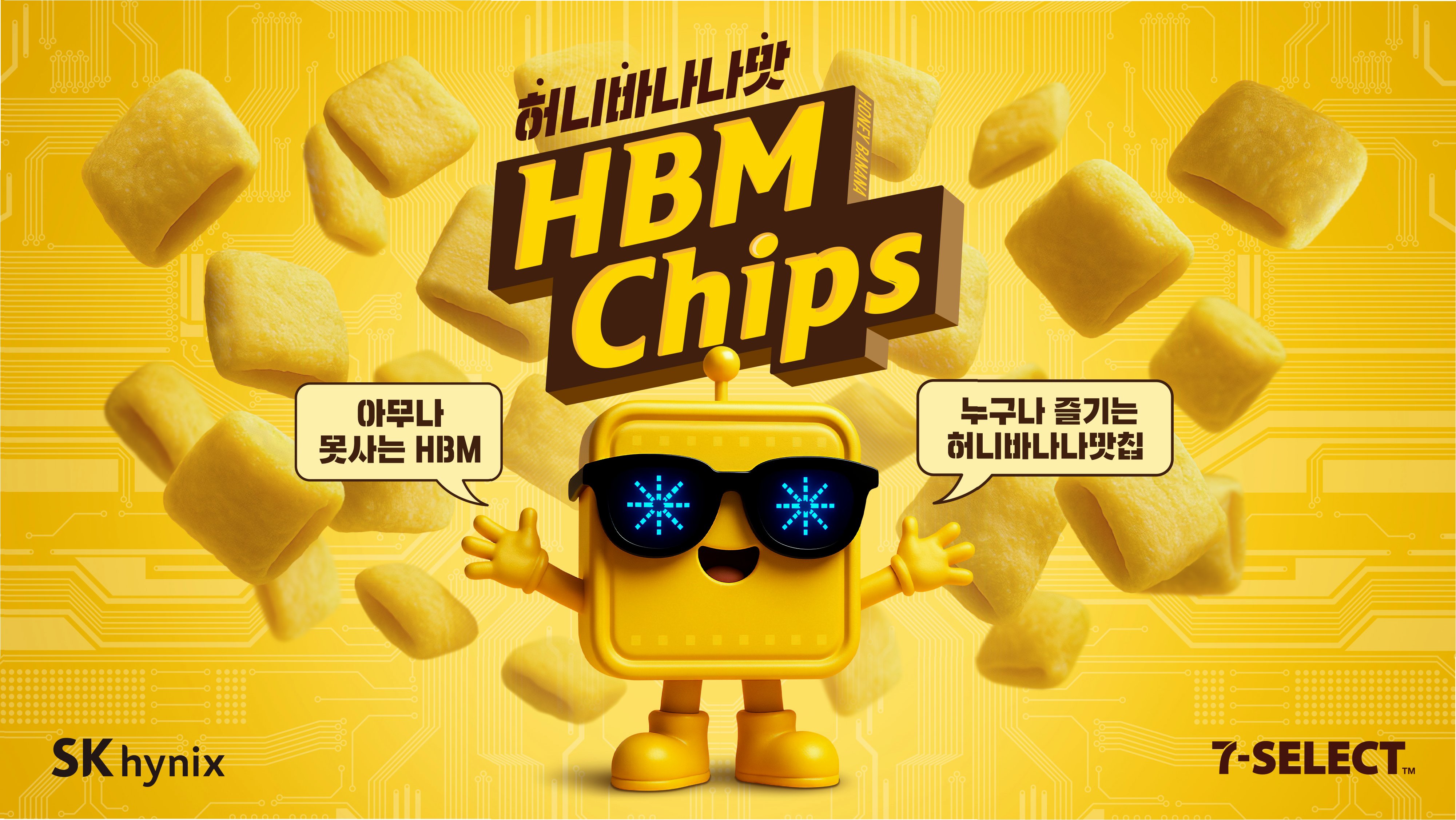 이번 협업의 결과물은 바로 '세븐셀렉트 허니바나나맛 HBM 칩'입니다. 제품명 'HBM 칩'은 허니(Honey), 바나나(Banana), 맛(Mat), 과자(Chips)의 약자로, 고대역폭메모리(HBM)와 반도체 칩을 동시에 나타내는 중의적인 표현입니다. 이처럼 제품명부터 반도체 기술을 연상시키는 독특한 콘셉트는 소비자들의 호기심을 자극합니다. 스낵 형태도 반도체 칩을 떠올릴 수 있도록 사각형으로 구현하여, 시각적인 재미를 더했습니다. 바삭한 옥수수칩에 달콤한 허니바나나맛 크림을 더해 맛과 재미를 모두 잡았다는 평가입니다.
