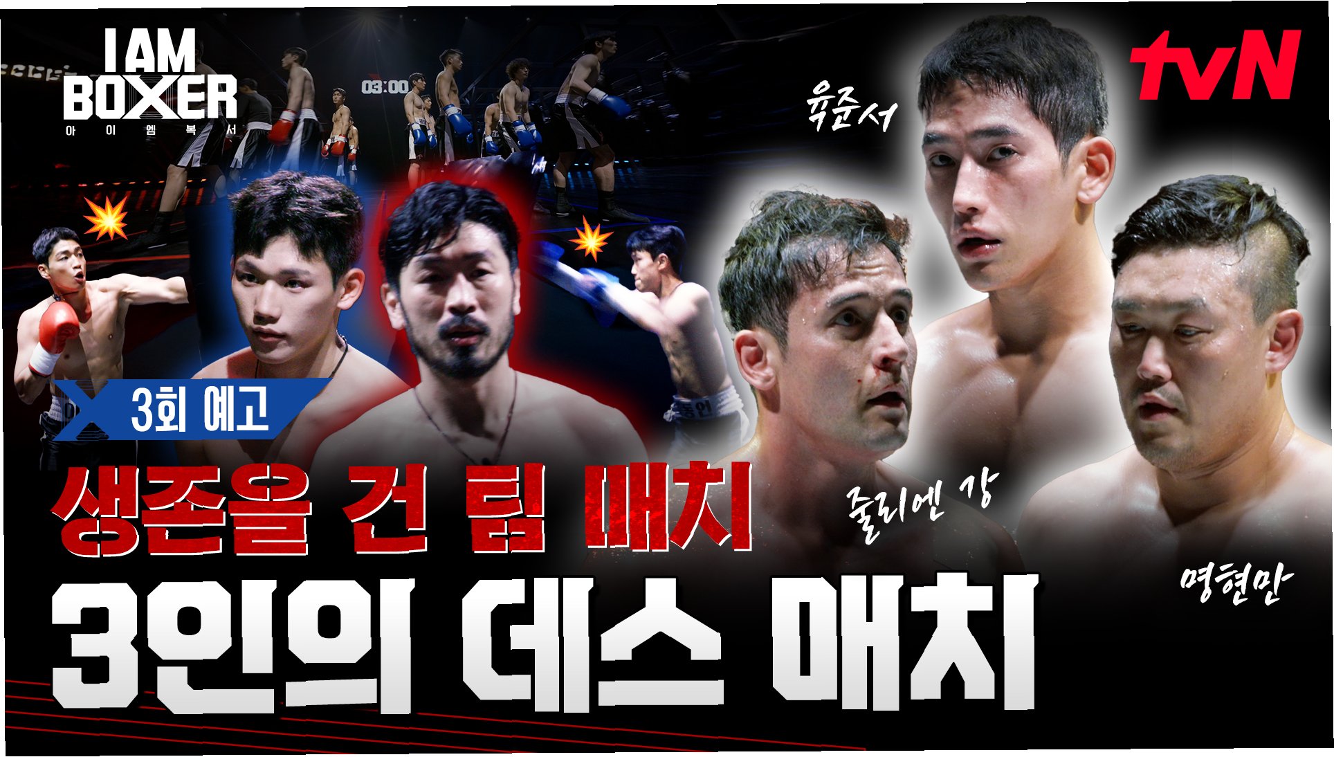 '아이 엠 복서'에서 명현만과 줄리엔 강의 1대 1 데스 매치가 펼쳐집니다. 치열한 경쟁 끝에 마동석의 '다운' 선언! 과연 승자는 누구일까요? 5일 방송에서 확인하세요!