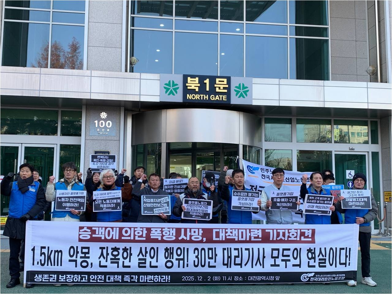 민주노총 전국서비스산업노동조합 대리운전노조는 대전시청 앞에서 기자회견을 열고 대책 마련을 촉구했습니다. 노조 측은 "대리기사는 매일 고객의 폭언과 폭행, 심하면 살해 위험 속에 일해 왔다"며 "작업중지권을 보장하고 위험한 업무를 강요하는 플랫폼 기업을 규제해야 한다"고 강조했습니다. 이들의 외침은 대리운전 기사들의 안전을 위한 사회적 관심과 제도 개선을 요구하고 있습니다.