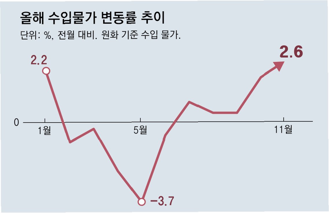 국제 유가 하락에도 불구하고 원·달러 환율이 1450원대를 돌파하는 고환율 현상이 지속되면서 수입물가가 5개월 연속 상승세를 이어갔습니다. 고환율이 에너지 가격 안정 효과를 상쇄해버린 탓입니다. 수입 물가 상승은 통상 1~3개월의 시차를 두고 국내 소비자물가에 전이되는 만큼, 연말연시 식탁 물가와 공산품 가격에 비상이 걸렸습니다.