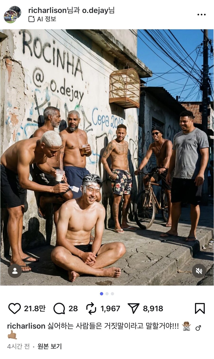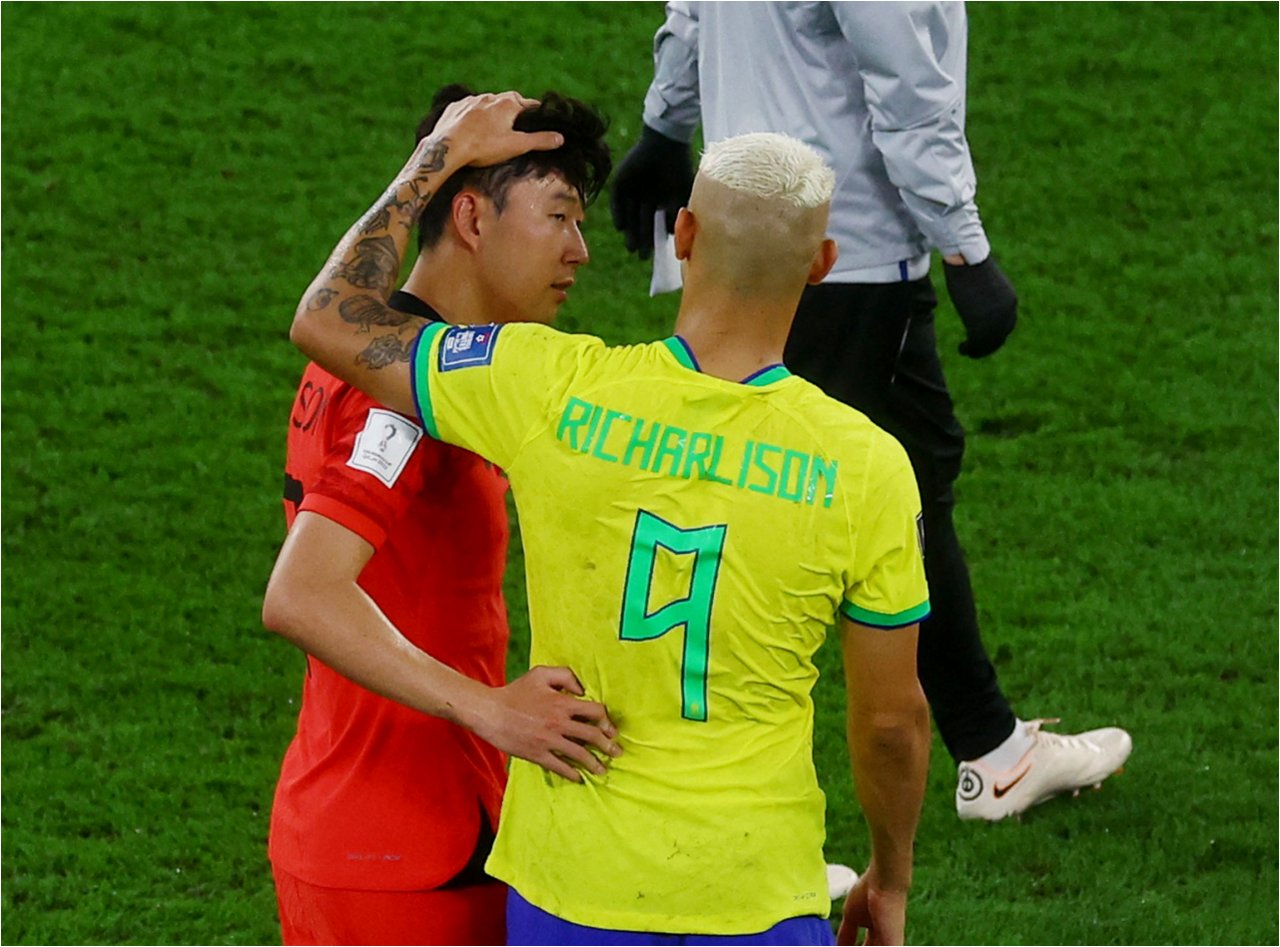 히샬리송은 다시 한번 손흥민을 향한 애정을 드러냈다. 19일 개인 SNS를 통해 갑자기 AI로 제작한 듯한 사진 세 장을 게시물로 업로드했다. 히샬리송을 비롯해 호나우지뉴, 네이마르, 호나우두 등 브라질을 대표하는 선수들이 한 곳에 있었는데, 그 중에는 손흥민도 있었다.