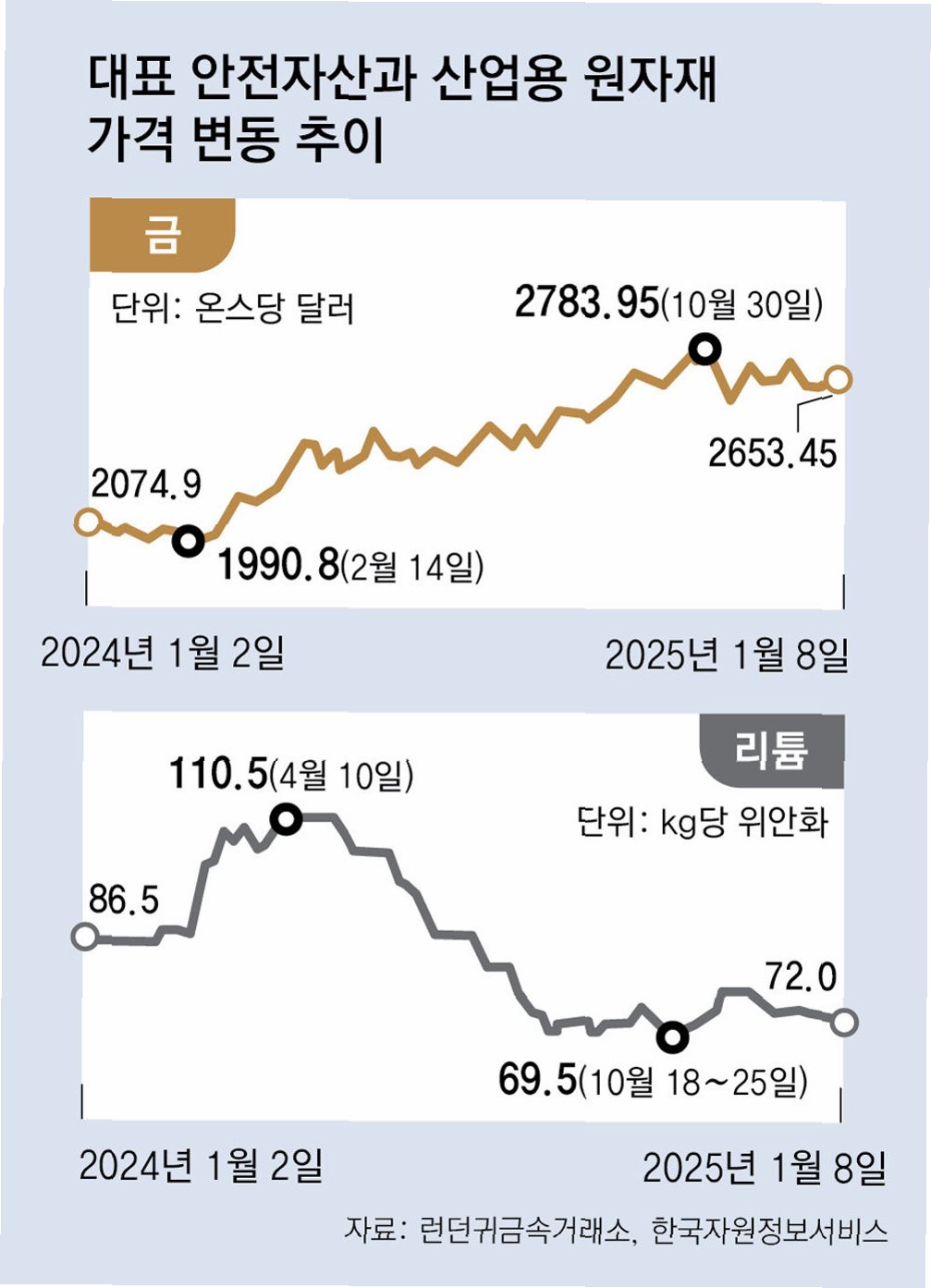 금값은 2021년 말 1827달러에서 2022년 말 1826달러로 움직이지 않았지만, 2023년 말 2071달러로 사상 첫 2000달러를 돌파했고요. 2024년 말에는 2641달러로 역사적 고점을 높였습니다. 금값은 올해만 70% 넘게 치솟으며 4560달러도 넘었습니다. 도널드 트럼프 미국 대통령의 관세 정책이 달러와 미국채에 대한 신뢰를 흔들면서 금값은 빠르게 상승했습니다.