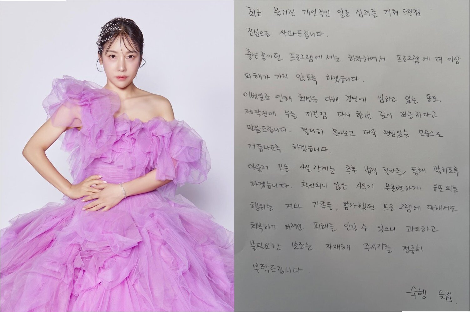 A.숙행은 이번 사건으로 인해 프로그램에 피해를 주지 않기 위해 하차를 결정했습니다.