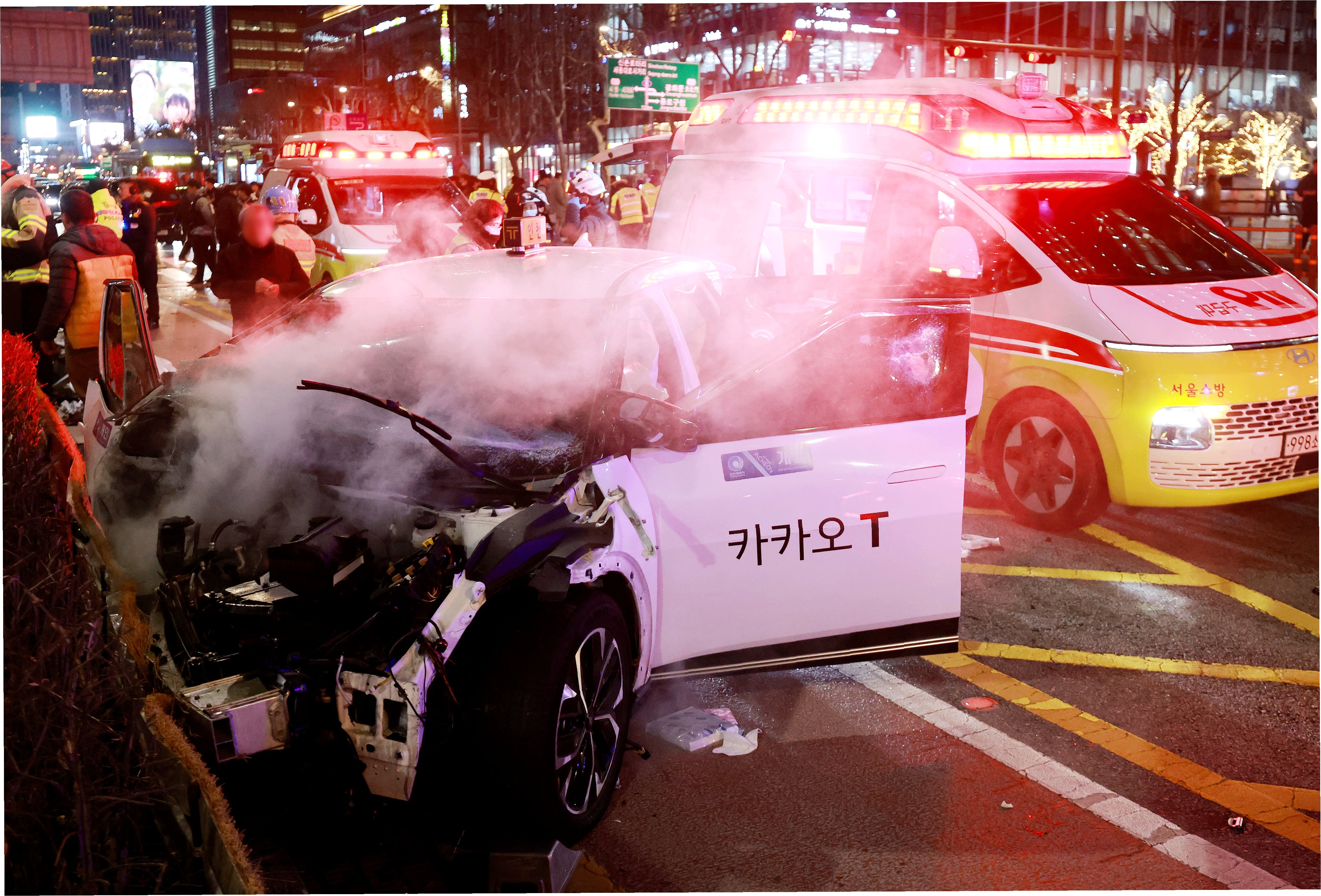 사고는 70대 운전자가 몰던 택시가 앞서 달리던 승용차를 들이받으면서 시작되었습니다. 이후 택시는 횡단보도 옆 신호등과 충돌한 뒤, 또 다른 승용차를 들이받았습니다. 연쇄적인 충돌 끝에 택시는 인도로 돌진, 횡단보도에서 신호를 기다리던 시민들을 덮쳤습니다. 사고 차량은 전기차로 확인되었으며, 사고 직후 화재가 발생했습니다.