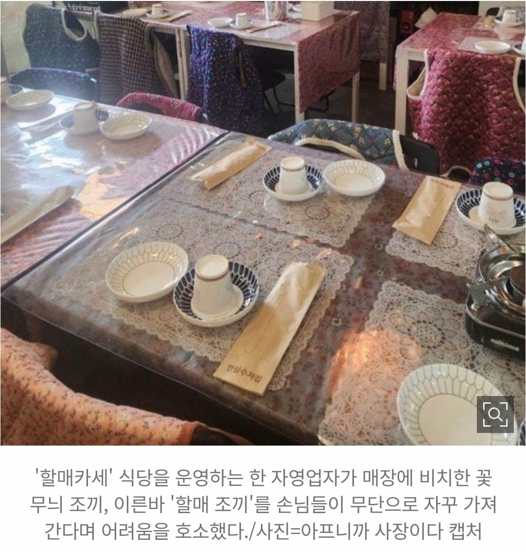 자영업자 커뮤니티 ‘아프니까 사장이다’에는 최근 ‘할매카세 할매조끼가 계속 없어져요’라는 제목의 글이 올라왔다. 글을 올린 A씨는 할머니 집에 온 듯한 분위기를 연출하기 위해 겨울철 손님들이 외투 대신 입을 수 있도록 꽃무늬 조끼, 이른바 ‘할매조끼’를 의자에 비치해 두었지만 조끼가 계속 사라지고 있다고 호소했다.