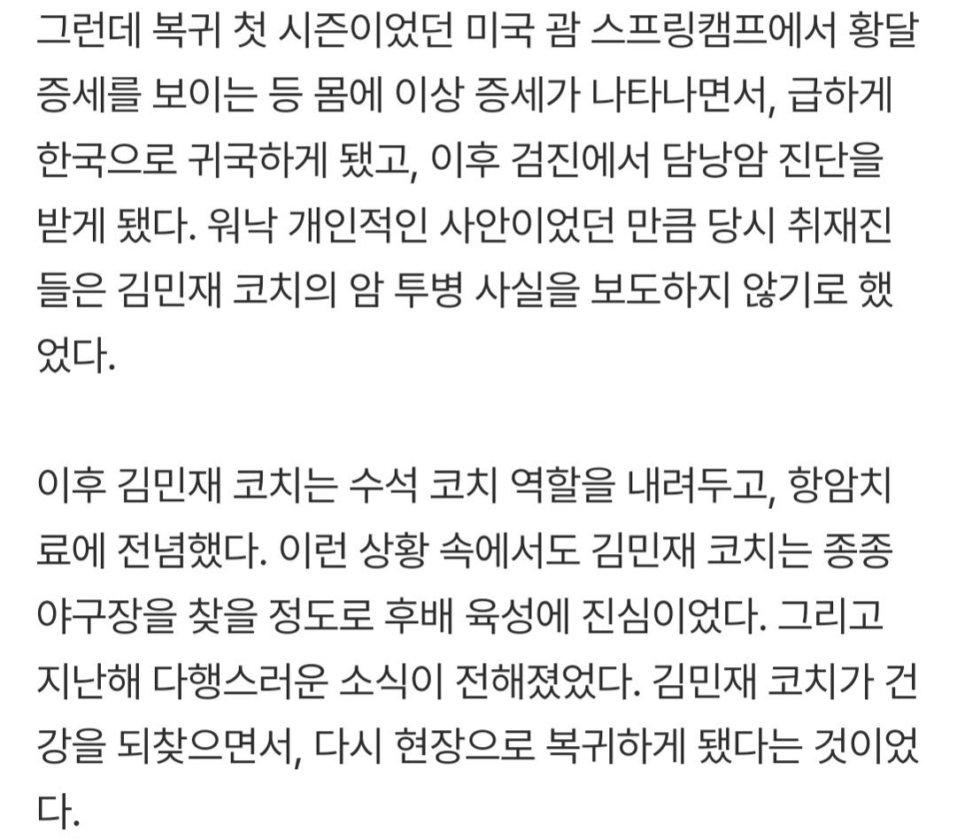김민재 코치는 괌 스프링캠프에서 건강 이상 징후를 보인 후 담낭암 진단을 받았습니다. 수석 코치직을 내려놓고 치료에 전념하는 동안에도 후배 육성에 대한 열정을 놓지 않았습니다. 다행히 건강을 회복하여 현장 복귀를 꿈꿨지만, 결국 갑작스럽게 세상을 떠나 많은 이들을 안타깝게 했습니다. 그는 1군보다는 2군에서 선수들을 지도하며 후배 사랑을 실천했습니다. 그의 긍정적인 에너지와 끊임없는 노력은 많은 선수들에게 귀감이 되었으며, 그의 부재는 야구계에 큰 슬픔을 안겨주고 있습니다. 그의 투병과 재기, 그리고 야구에 대한 열정은 많은 이들에게 잊을 수 없는 감동을 선사했습니다.