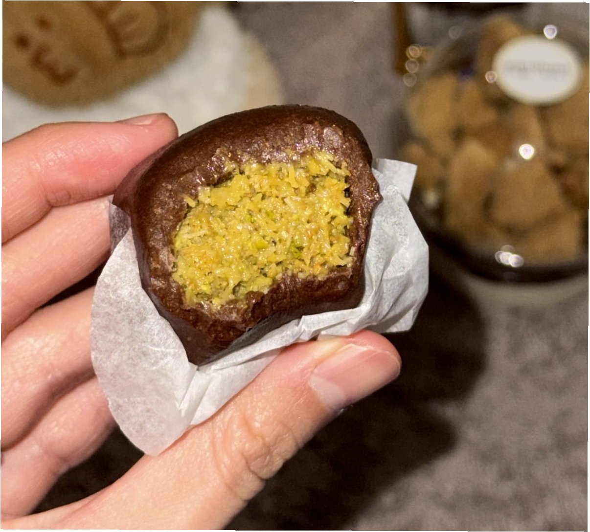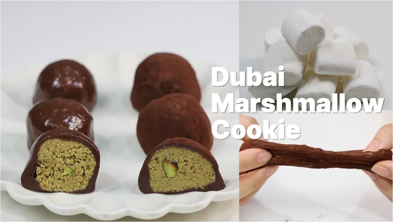 A.해당 쿠키는 피스타치오 스프레드, 화이트 초콜릿, 버터에 구운 쿠나파, 마시멜로, 코코아 파우더 등을 사용하여 만들어집니다.