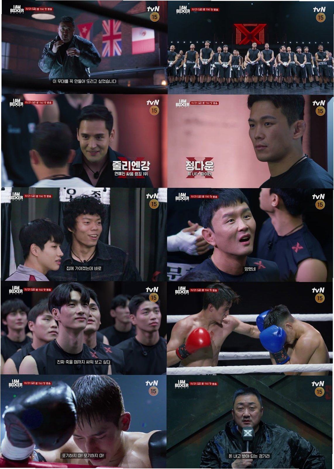 마동석의 첫 예능 도전작 '아이 엠 복서'는 11월 21일 오후 11시에 첫 방송될 예정입니다. K-복싱의 부활을 향한 마동석의 열정과 출연자들의 뜨거운 경쟁, 그리고 압도적인 스케일의 세트까지, '아이 엠 복서'는 시청자들에게 다채로운 볼거리를 선사할 것입니다. 첫 방송을 통해 마동석과 출연자들이 선사할 감동과 재미를 기대해 주세요.