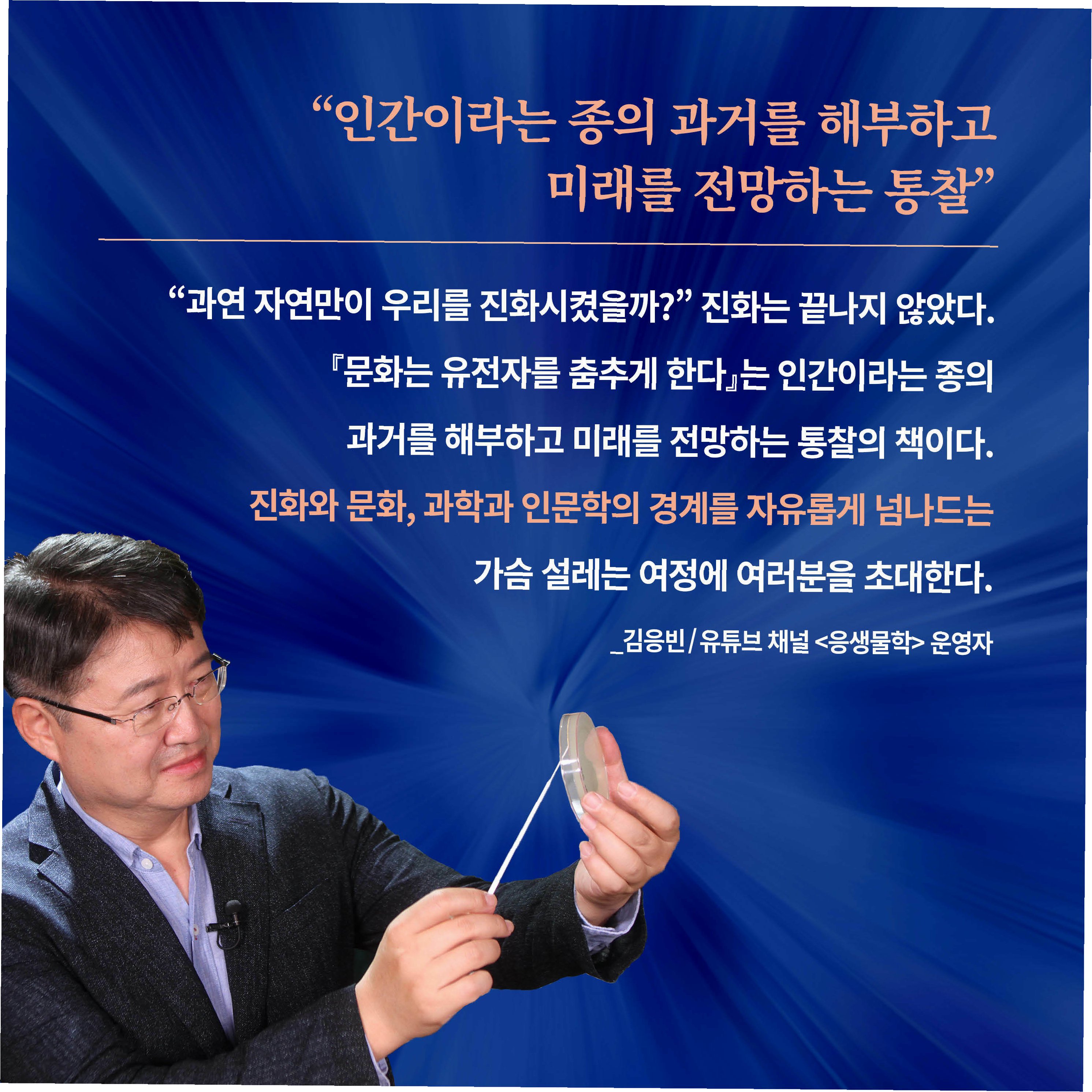 인간은 문화 없이는 생존할 수 없습니다. 타인을 모방하고 사회 규범을 따르며, 규범 위반을 처벌하려는 본성을 지녔습니다. 문화는 인간을 생물학적으로 변화시켰습니다. 결국, 인간은 문화라는 울타리 안에서 가장 성공적으로 진화한 동물입니다. 인간은 다른 어떤 동물보다 강하게 문화와 함께 결합하여 공진화한다는 점에서 특별합니다.