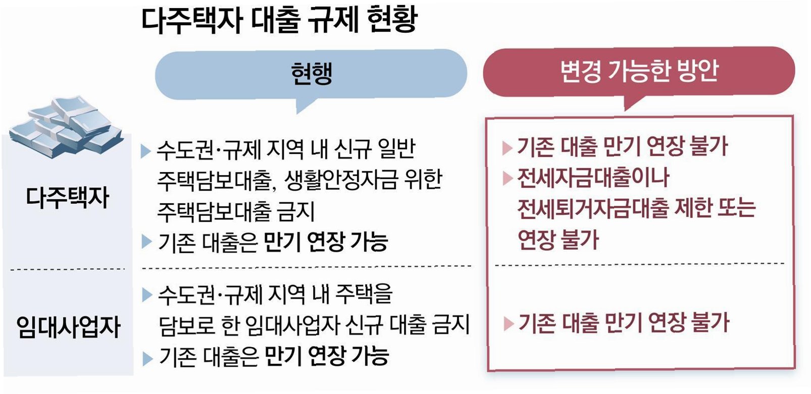 다주택자 대출 만기 연장 금지 방안은 수도권 규제지역에 집중하며, 임대사업자를 주요 타깃으로 합니다. 이는 가계부채 관리 강화와 부동산 금융 쏠림 현상 완화를 목표로 하며, 관련 대책 발표 시점도 연기되었습니다.