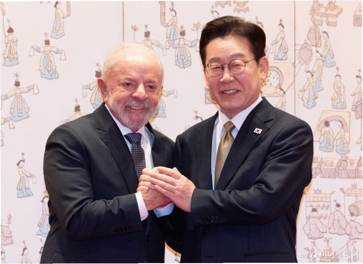 이재명 대통령은 오늘 청와대에서 국빈으로 방한한 루이스 이나시우 룰라 다시우바 브라질 대통령 내외를 직접 맞이했습니다. 이는 이 대통령 취임 후 첫 국빈 초청으로, 룰라 대통령의 차량은 청와대 입구부터 취타대와 전통 의장대의 호위를 받으며 위엄 있게 진입했습니다. 이 대통령은 금빛 넥타이로 포인트를 준 감색 양복을, 김혜경 여사는 고운 파란색 저고리에 하얀색 치마 한복을 착용하여 정중한 예를 갖추었습니다. 차에서 내린 룰라 대통령과 이 대통령은 따뜻한 포옹과 악수를 나누며 양국 간의 우의를 다졌습니다.