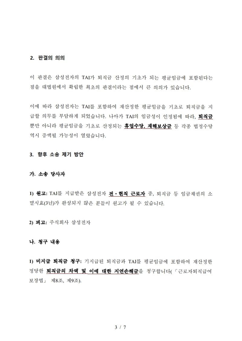 대법원이 삼성전자의 목표인센티브(TAI)를 퇴직금 산정 기준인 '평균임금'에 포함해야 한다고 판결한 이후, 퇴직금 재산정 소송이 삼성전자뿐만 아니라 삼성그룹 계열사 전반으로 확산되고 있습니다. 최근 삼성전자 퇴직자 38명이 추가로 소송을 제기하며 총 164명으로 늘어났으며, 삼성전자서비스 퇴직자 13명도 별도로 소송에 참여했습니다. 또한 삼성SDS, 삼성물산, 삼성E&A, 삼성바이오로직스 등 다른 계열사 퇴직자들도 소송 참여 의사를 밝히고 있어 분쟁이 그룹 전반으로 번질 조짐입니다.