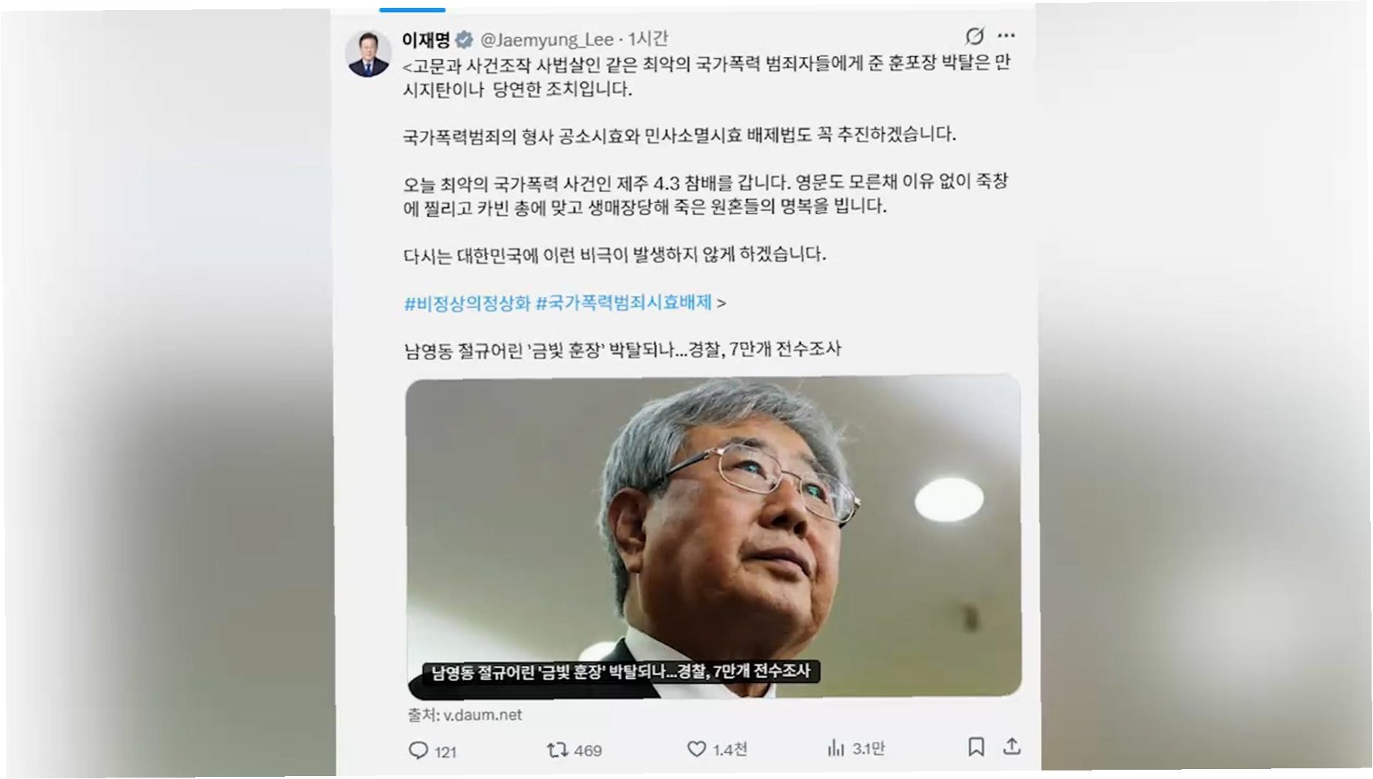 국가폭력 범죄자에 대한 훈장 박탈과 공소시효 배제 추진, 그리고 제주 4·3 사건 희생자 추모를 통해 이재명 대통령은 과거사 문제 해결과 정의로운 사회 구현에 대한 강력한 의지를 표명했습니다. 이는 국가 폭력의 피해자들에게 위로를, 그리고 국민들에게는 안전한 사회에 대한 희망을 전달합니다.
