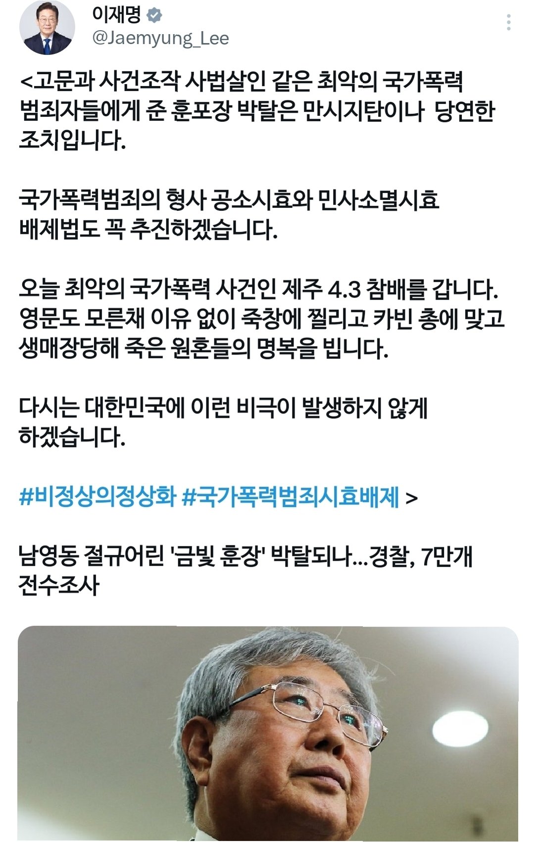 이재명 대통령은 과거 고문과 사건 조작에 가담한 수사기관 관계자들이 받은 서훈에 대해 취소 조치가 착수된 것에 대해 '사법살인 같은 최악의 국가폭력 범죄자에게 준 훈·포장 박탈은 만시지탄이나 당연한 조치'라고 밝혔습니다. 이는 과거 국가 권력에 의한 폭력 피해자들에게 정의를 실현하려는 의지를 보여줍니다.