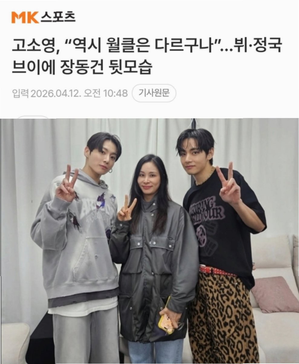 특히 이번 만남에서 가장 눈길을 끈 것은 백스테이지에서 만난 뷔, 정국과의 인증샷이었습니다. 고소영은 두 사람 사이에서 밝은 미소를 지으며 브이 포즈를 취했고, 뷔와 정국 역시 자연스럽게 브이를 맞추며 화기애애한 분위기를 자아냈습니다. 편안한 캐주얼 차림 속에서도 남다른 아우라가 느껴지는 세 사람의 조합은 마치 한 편의 화보를 연상케 했습니다.