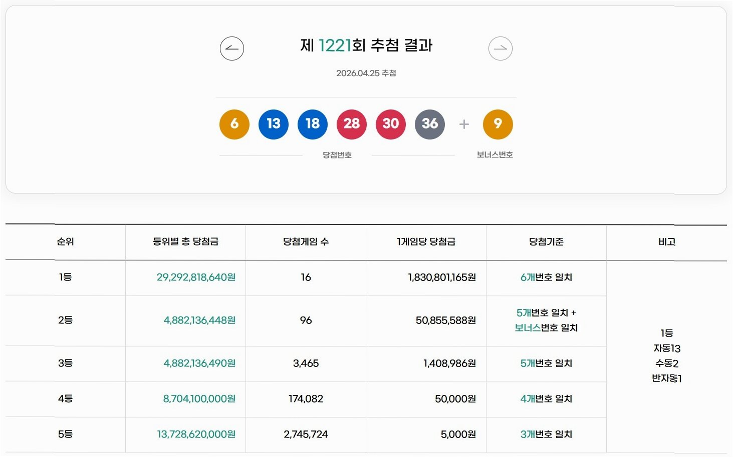 동행복권은 제1221회 로또 추첨 결과, 당첨 번호가 6, 13, 18, 28, 30, 36이라고 발표했습니다. 보너스 번호는 9였습니다. 이번 추첨에서 1등 당첨자는 총 16명으로, 각 18억 3080만원이라는 막대한 상금을 받게 되었습니다. 꿈에 그리던 억대 부자가 탄생하는 순간입니다.