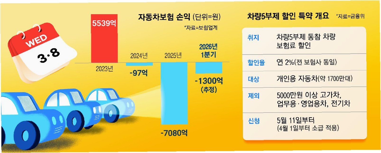서울시 종로구 세종로공영주차장에서 차량 2·5부제에 동참한 차주의 자동차보험료(자보료)를 연간 2% 할인해주는 특약상품 출시 소식이 전해졌습니다. 손해보험업계는 상생금융이라는 취지에는 공감하지만, 이로 인한 경영 악화에 대한 우려를 표하고 있습니다. 이번 특약으로 연간 2%의 자보료 할인이 적용될 경우, 업계가 부담해야 할 보험료 감소 규모는 연간 2400억원에 달할 것으로 추산됩니다. 이는 지난해 이미 7080억원의 자동차보험 적자를 기록했던 손보업계에 '엎친 데 덮친 격'입니다.