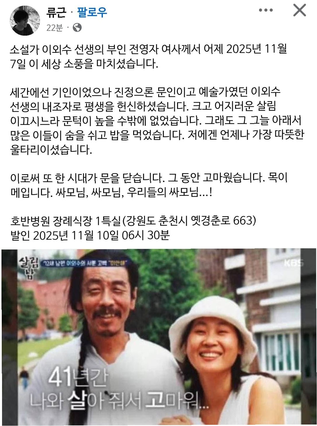 소설가 이외수 작가의 부인 전영자 씨가 별세했다는 안타까운 소식이 전해졌습니다. 향년 72세로, 유족들은 그녀가 평생의 반려자를 잃은 후 외로움을 느꼈다고 전했습니다.
