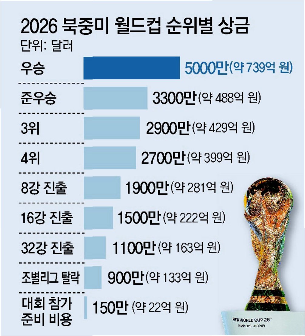 2026 FIFA 북중미 월드컵을 앞두고 물가 상승과 이동 비용 증가에 대한 참가국들의 불만이 커지자, FIFA가 모든 참가국에 대한 재정 지원금을 15% 인상하기로 결정했습니다. 이에 따라 본선 진출국들은 기존 150만 달러에서 250만 달러(약 15억 원)의 대회 준비금을 받게 됩니다. 이는 FIFA의 견고한 재정 상태를 바탕으로 회원국을 지원하고 수익을 축구에 재투자하려는 노력의 일환입니다.