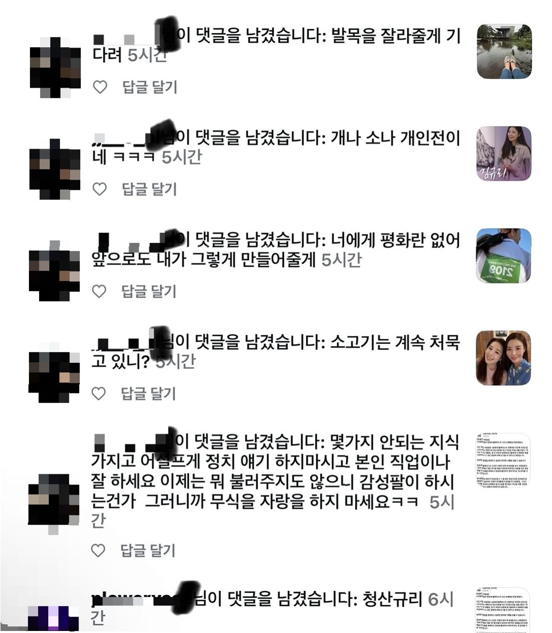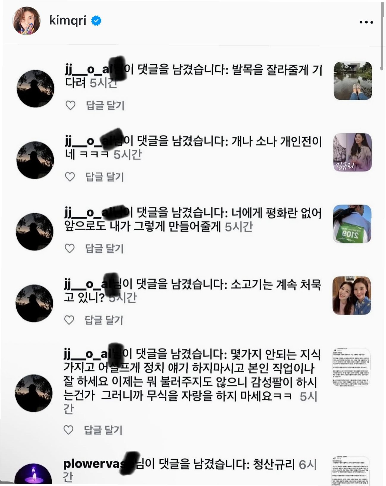 A.'XX을 잘라줄게', '너에겐 평화란 없어', '무식을 자랑하지 마세요', 'XX규리' 등 인신공격과 협박성 내용이 담겨 있었습니다.