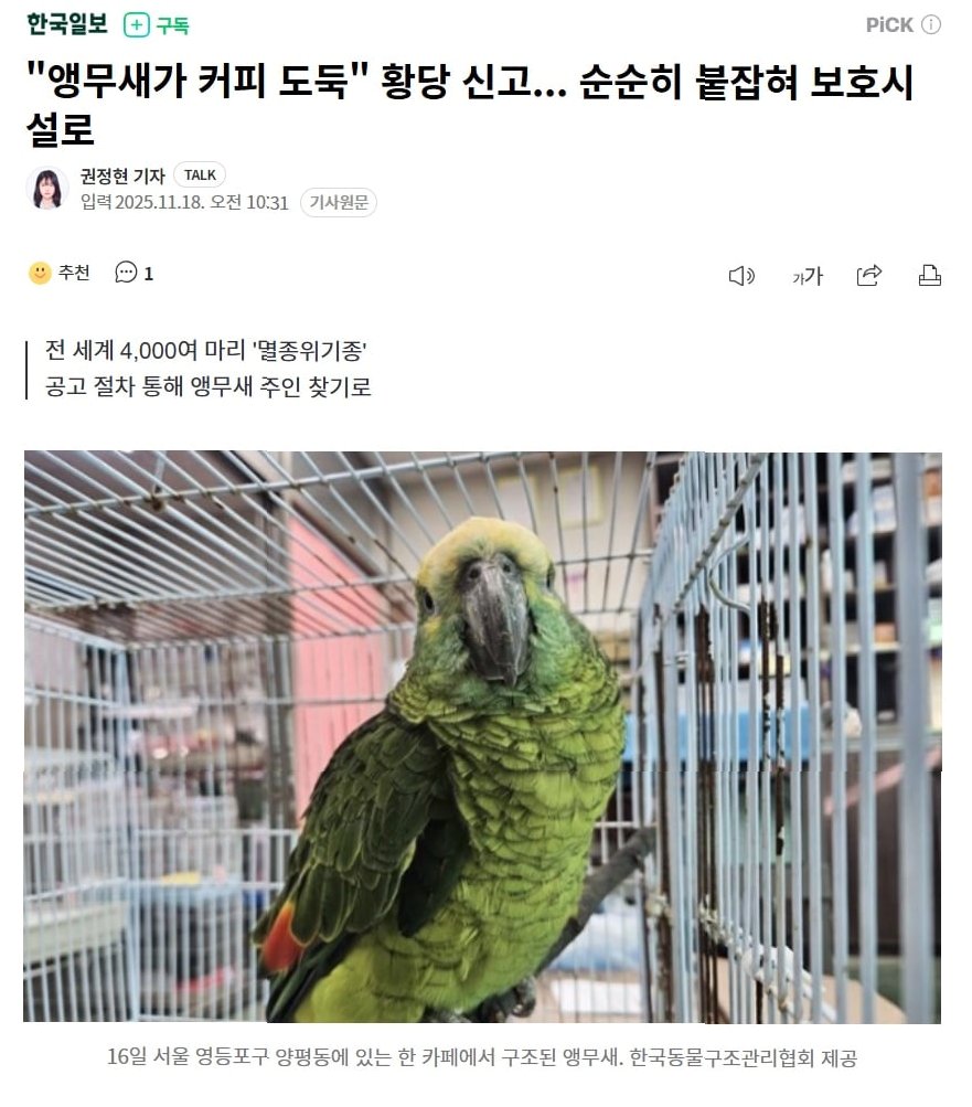 경찰은 이 앵무새가 지구상에 4,000여 마리밖에 남지 않은 노랑머리아마존앵무새일 것으로 추정했습니다. 노랑머리아마존앵무새는 ‘멸종위기에 처한 야생동식물종의 국제거래에 관한 협약’(CITES)에 등재된 종으로, 개인 입양이 불가능할 정도로 희귀한 존재입니다. 이러한 사실은 단순한 커피 도둑 사건이 아닌, 멸종 위기에 놓인 야생동물의 보호와 관련된 중요한 문제임을 시사합니다. 경찰은 앵무새를 안전하게 종이상자에 담아 한국동물구조관리협회로 인계했습니다.