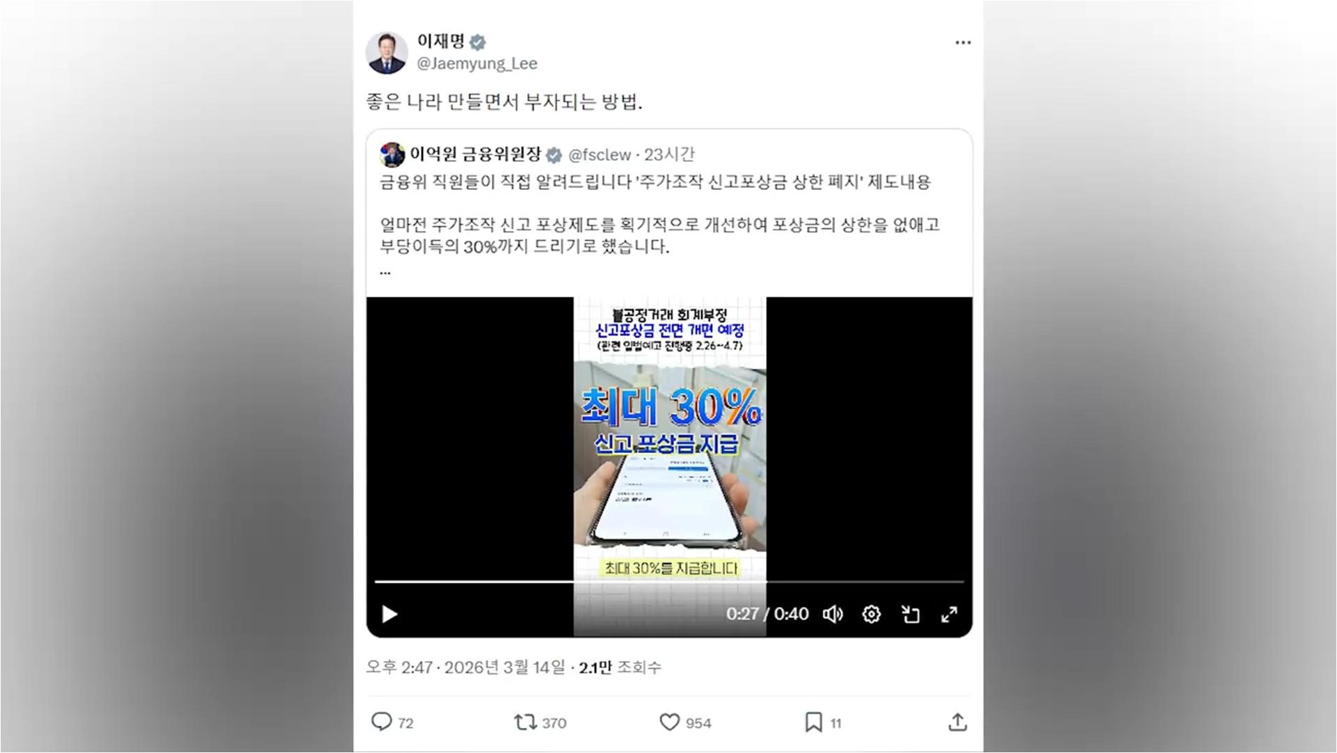 주가 조작 신고 포상금 상한 폐지, '대박'의 기회를 잡으세요!이재명 대통령이 SNS를 통해 주가 조작 신고 포상금 상한 폐지 정책을 적극 홍보하며 국민들의 적극적인 참여를 독려했습니다. "좋은 나라 만들면서 부자 되는 방법"이라는 제목으로 공유된 게시물에는 이억원 금융위원장의 글이 담겨 있으며, 주가 조작 신고를 통해 최대 부당 이득의 30%까지 포상금으로 지급받을 수 있다는 내용이 강조되었습니다. 이는 기존 최대 30억 원에서 10억 원까지 지급되던 포상금 상한이 완전히 폐지되었음을 의미합니다. 금융 당국은 이제 1000억 원 규모의 주가 조작 사건 신고 시, 신고자의 기여도에 따라 이론적으로 최대 300억 원까지 포상금을 지급할 수 있다고 밝혔습니다. 이 대통령은 "팔자 고치는 데는 로또보다 확실히..