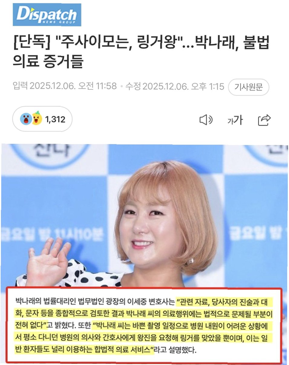 디스패치는 박나래가 의료기관이 아닌 곳에서 불법 의료 행위를 받았다는 내용을 보도했습니다. 구체적으로, 일산의 한 가정집에서 링거를 맞고 항우울성 약품을 대리 처방받았다는 의혹을 제기하며 관련 사진을 공개했습니다. 이러한 보도는 대중들에게 큰 충격을 안겨주었으며, 박나래의 이미지에 부정적인 영향을 미칠 수 있다는 우려를 낳았습니다. 디스패치의 보도 내용이 사실로 밝혀질 경우, 박나래는 법적인 책임을 져야 할 수도 있습니다. 따라서, 정확한 사실 관계를 파악하기 위한 추가적인 정보가 필요한 상황입니다.