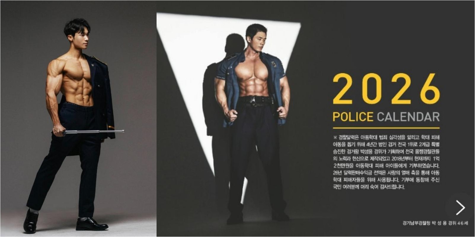 2026년 경찰 달력은 건강한 몸과 따뜻한 마음을 가진 경찰관들이 아동학대 피해 아동을 돕기 위해 만든 특별한 프로젝트입니다. 새벽 4시 공복 유산소로 몸을 단련하고, 기부를 통해 나눔의 가치를 실천하는 그들의 이야기는 우리 사회에 희망의 메시지를 전달합니다.