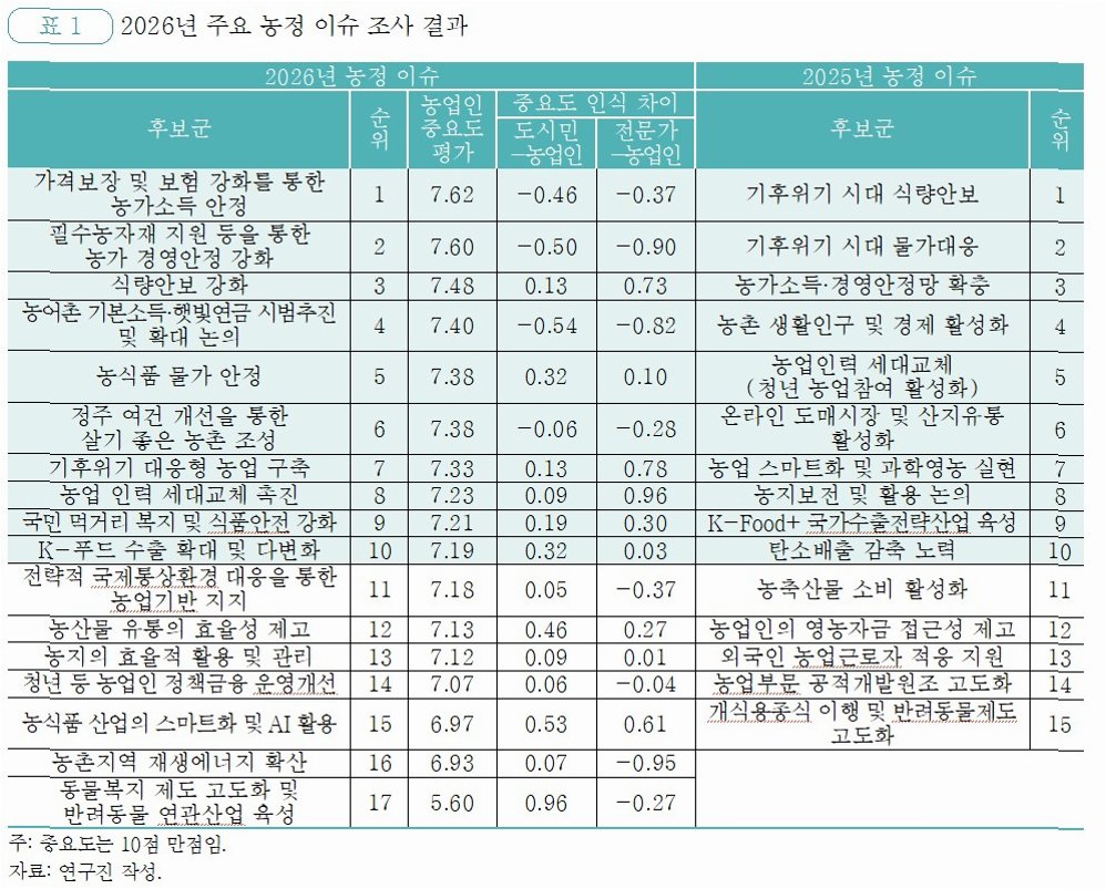 두 기관은 특히 ‘농가소득 안정’을 새해 농정의 핵심 의제로 꼽았다. 농경연은 “농작물재해보험과 농업수입안정보험 등 위험관리 제도가 운영되고 있음에도, 보장 수준이 실제 피해와 충분히 연동되지 못하고 적용 범위 역시 현장 수요를 포괄하지 못해 소득 안정 효과가 제한적”이라고 진단했다.