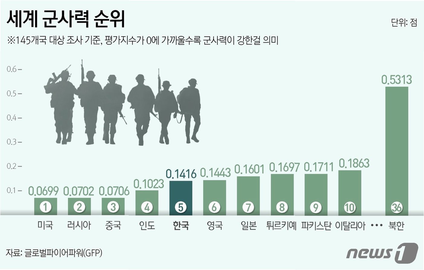 A.GFP 군사력 평가지수는 현역·예비군 병력, 지상 무기, 공군·해군 전력, 국방 예산, 경제력, 전시 동원 가능 인력 등 60개 이상의 개별 항목 지표를 활용하여 산출됩니다. 0에 가까울수록 완벽한 군사력을 의미합니다.