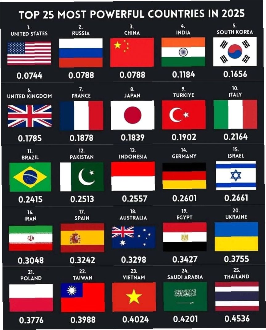 미국이 0.0741점으로 부동의 1위를 지켰으며, 러시아(2위), 중국(3위), 인도(4위)가 그 뒤를 이었습니다. 이들 1위부터 4위까지의 순위는 2006년 이후 20여 년간 변동 없이 유지되고 있습니다. 러시아는 우크라이나와의 전쟁 중에도 높은 지수를 유지했으며, 중국은 막대한 재정과 인적 자원을, 인도는 인구 및 지상군 규모에서 강점을 보였습니다.
