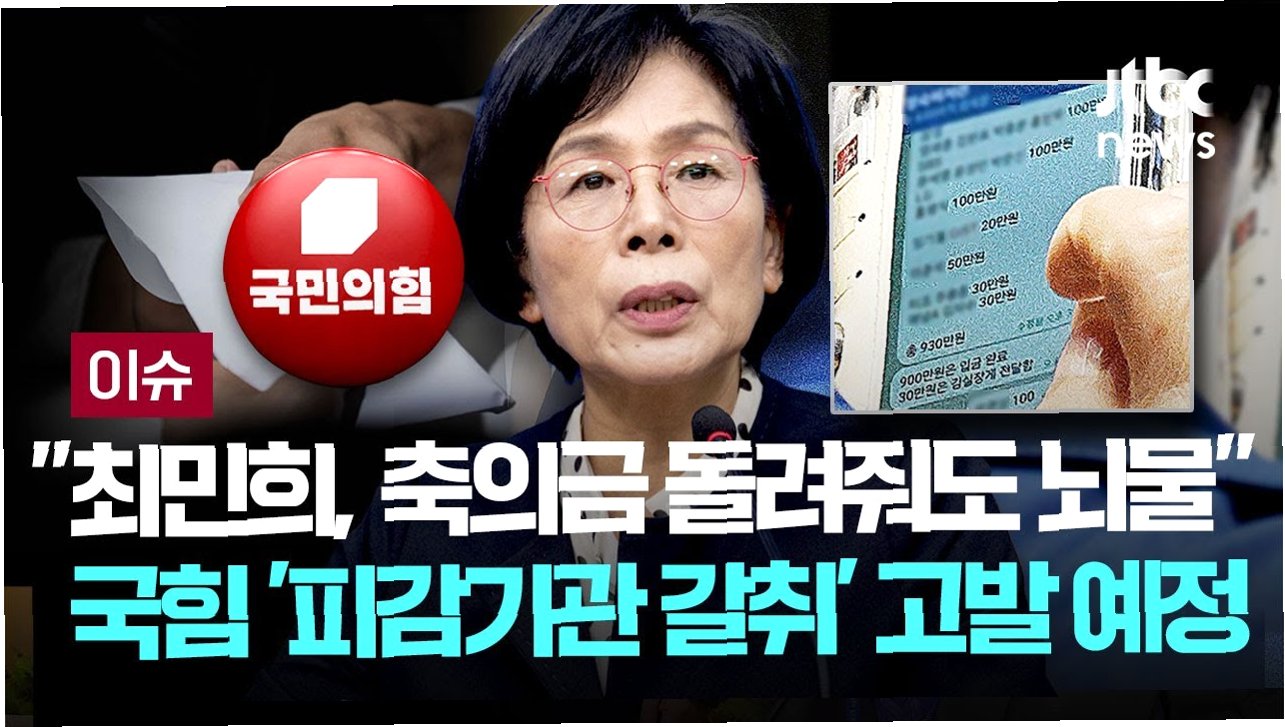국민의힘은 국정감사 기간 국회에서 딸의 결혼식을 치르면서 피감기관 등으로부터 축의금을 받아 논란이 된 더불어민주당 소속 국회 과학기술정보방송통신위원회 최민희 위원장을 경찰에 고발했습니다. 당 미디어국은 서울경찰청 민원실에 고발장을 제출했습니다. 국민의힘은 자녀 혼사를 명목으로 성명불상의 대기업 관계자 4인, 지상파 방송사 관계자 3인, 기업 대표 1인 등 총 8인에게 각 100만원씩 모두 800만원의 뇌물을 받은 혐의로 최 위원장을 고발했다고 밝혔습니다. 이 사건은 정치권에 큰 파장을 일으키며, 최 위원장의 거취 문제로까지 번지고 있습니다. 이로 인해 민주당은 최 위원장의 거취를 고심하고 있는 상황입니다. 당 지도부는 국감을 마친 뒤 사실관계를 따져보겠다는 방침이지만, 논란에 대한 최 위원장의 대응 방식에 대한 당내 비판의 목소리도 나오고 있습니다.