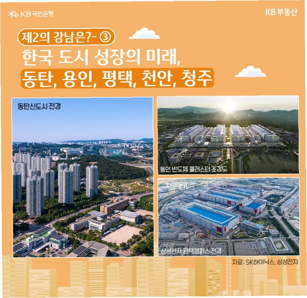 현재 '제2의 강남'으로 주목받는 곳은 청주의 오송, SK하이닉스 공장이 있는 지역, 천안아산역의 삼성 반도체 및 디스플레이 단지 인근 배방 신도시 등입니다. 이는 IT 및 반도체 산업과 결합된 '확장 강남'으로, 주거 차원을 넘어 산업적 기반까지 갖추었기에 난공불락이며 향후 한국 경제의 근간이 될 것으로 예상됩니다.